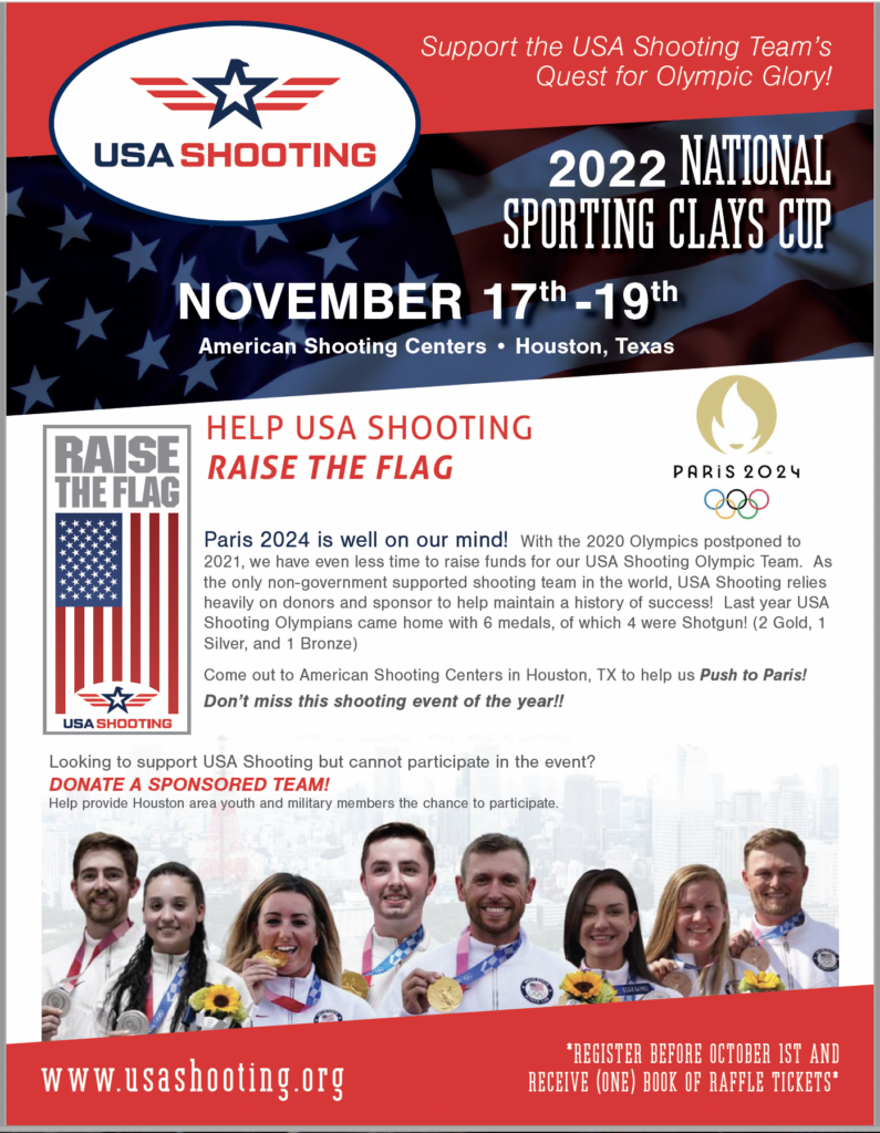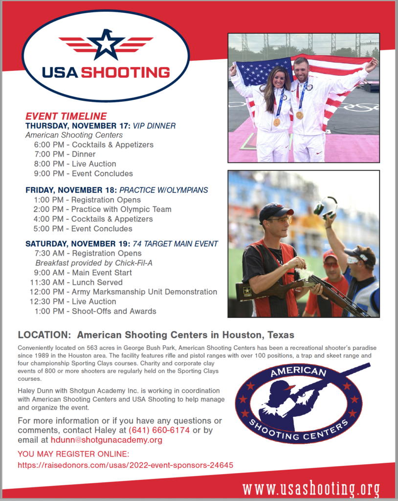 The 2022 National Sporting Clays Cup will be held November 17-19 at the American Shooting Centers in Houston, Texas. Check out the full event agenda below. Don’t miss out on your chance to shoot with USA Shooting’s Olympic athletes, register here.